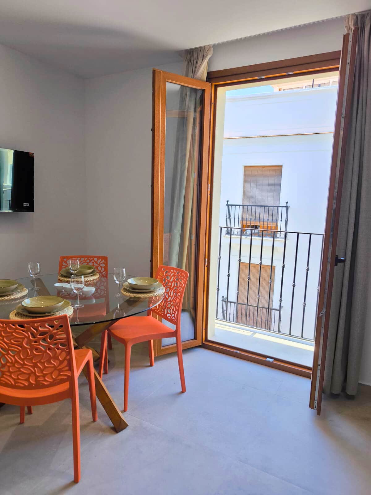 El salón cuenta con sofá cama doble, mesa de comedor, Smart TV y acceso a un balcón privado con vistas a las calles blancas del centro. El dormitorio principal dispone de cama doble, una segunda Smart TV y balcón.