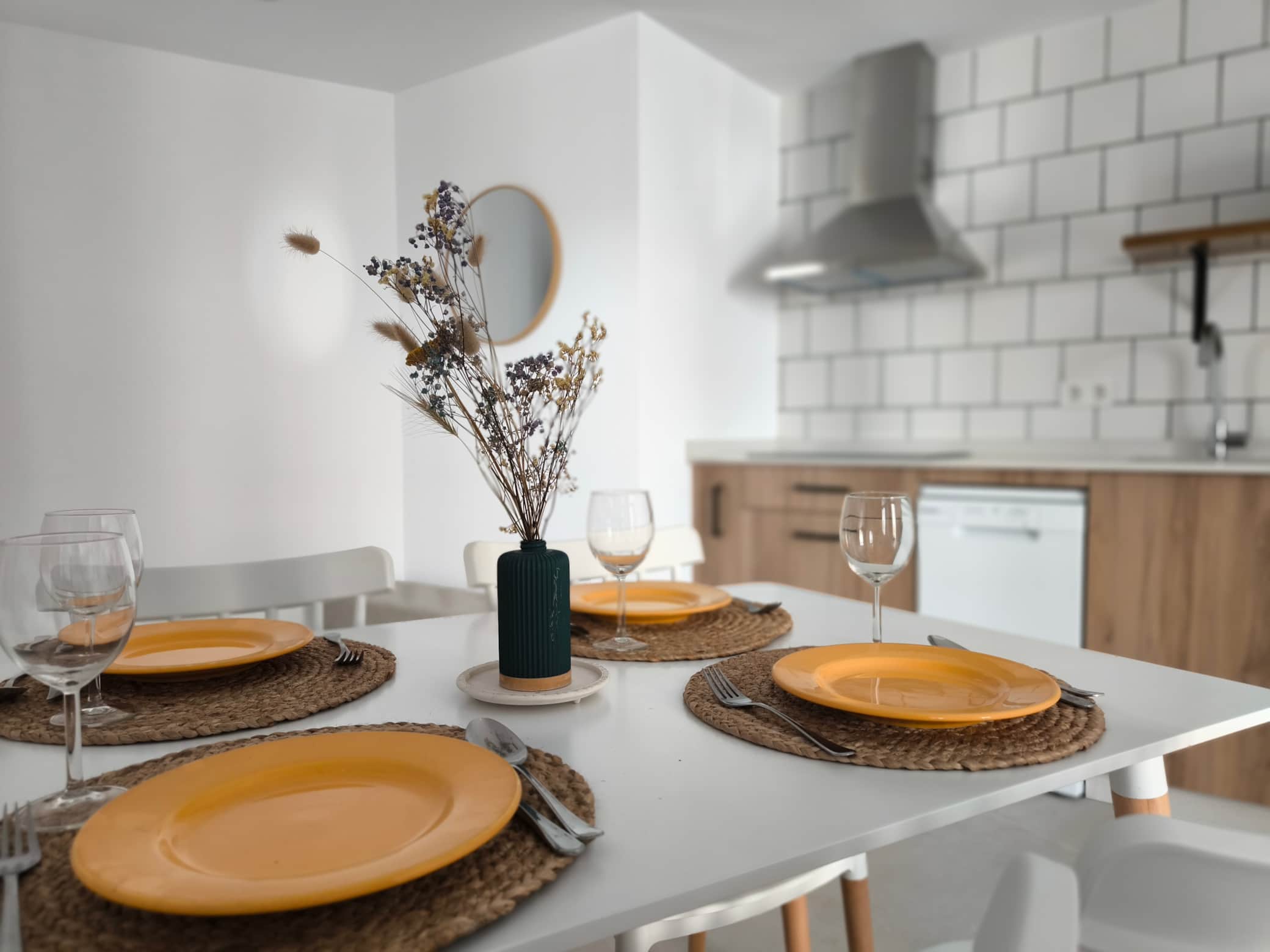 El salón cuenta con sofá, Smart TV y mesa de comedor, además de un sofá cama que amplía la capacidad. La cocina integrada está equipada con todo lo necesario para estancias cortas o largas (vitrocerámica, microondas, cafetera, nevera; lavadora comunitaria en la sala común del edificio).